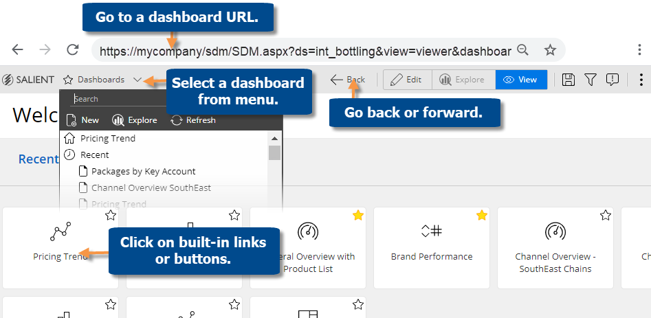 Go back and forward to dashboards you visited within a Salient Dashboards session. Click the browser's back and forward buttons or use the back button in the dashboard toolbar. Note that the history is cleared when you go to another page. |
