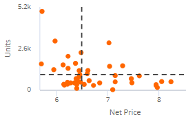 Plot of members along two axes to show trends and outliers. The points can represent key members (e.g., customers) or dimension members (e.g., regions). Additional variables can be used to color and size the points (i.e., "bubble chart"). |
