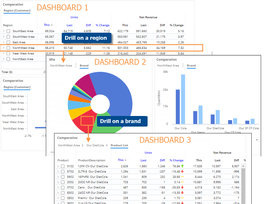 A custom drill-down is a set of preconfigured dashboards through which the user can drill. The custom drill path can include a variety of widget types and display settings to optimize the investigative process while allowing the user to select the item(s) on which to drill. For example, the custom drill-down might start with a comparison of regions and then go to a pie chart of brands for a particular region followed by a list of products within a brand for that region. Drilling on a dashboard in a custom drill-down opens the next dashboard or "step" that includes a filter for the drilled item(s). Users can drill on different items each time they use the custom drill-down. This option is like the storyboards feature in SIM.